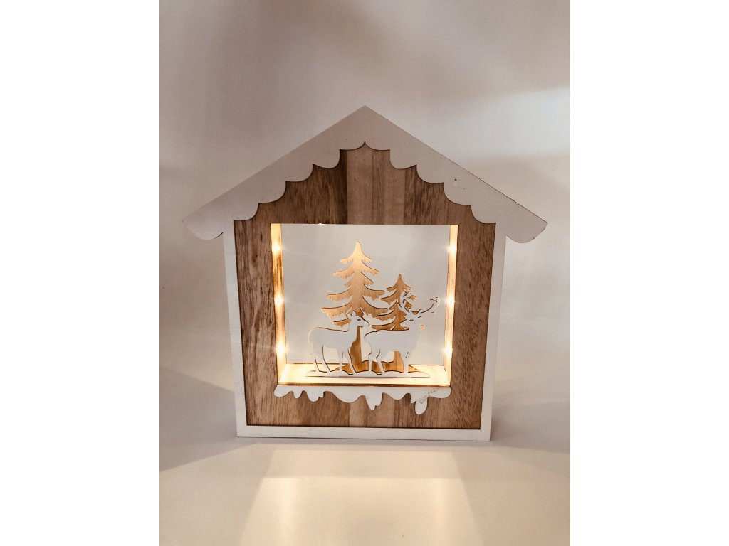 Dřevěná svítící dekorace ve tvaru domu s jelenem a laní.
