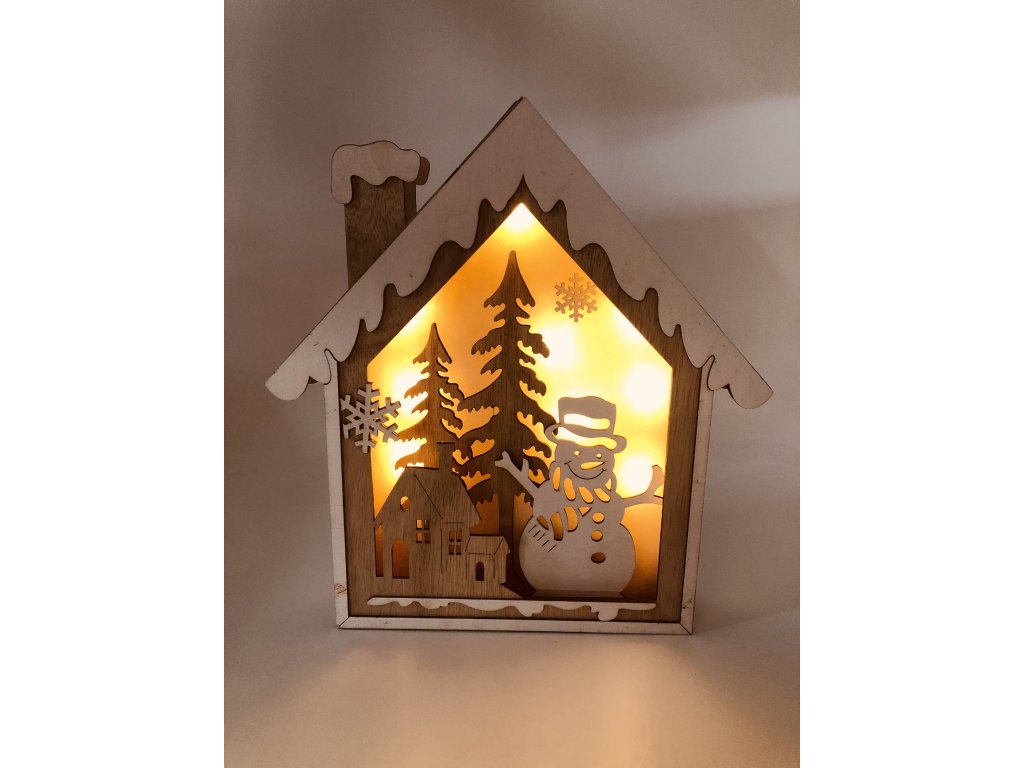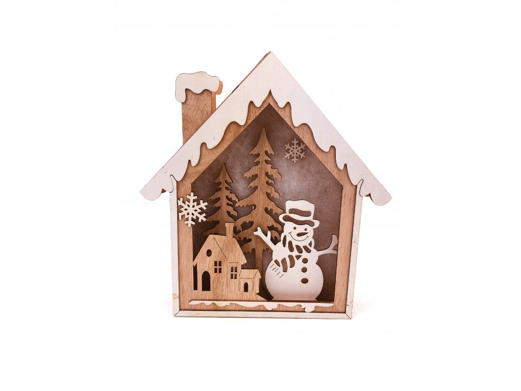 Dřevěná svítící dekorace ve tvaru domu se sněhulákem.