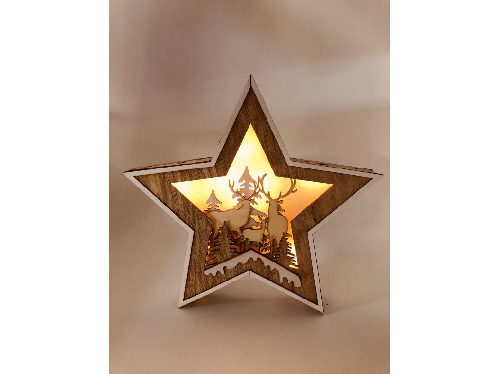 Dřevěná svítící dekorace ve tvaru hvězdy s jeleny a kolouškem.