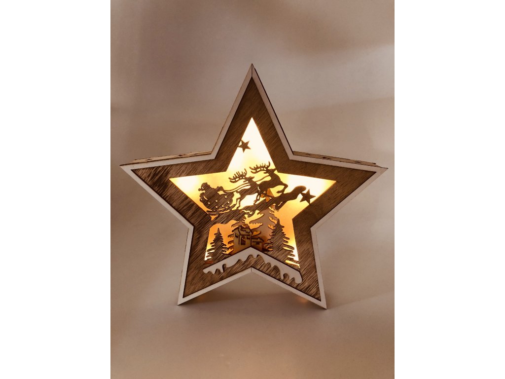 Dřevěná svítící dekorace hvězda - Santa Claus na saních