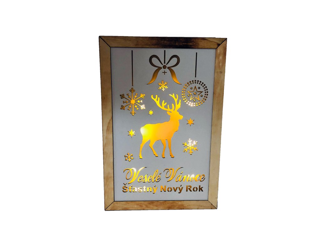 Dřevěná svítící dekorace Veselé Vánoce a Šťastný Nový Rok s motivy vloček a soba.