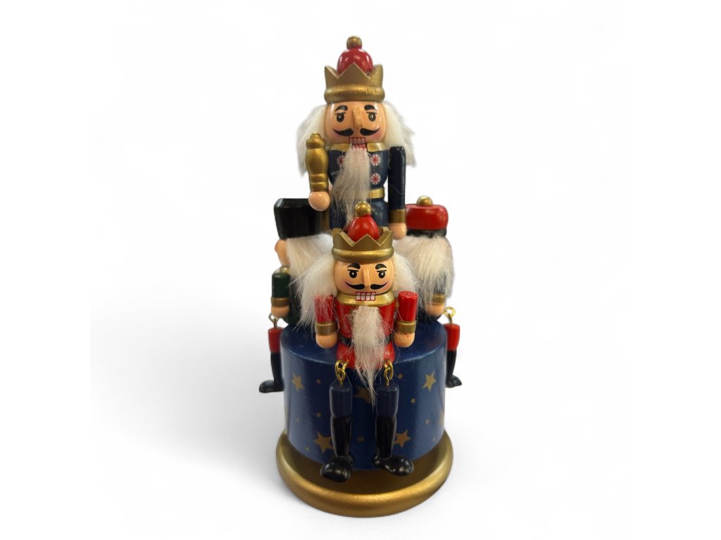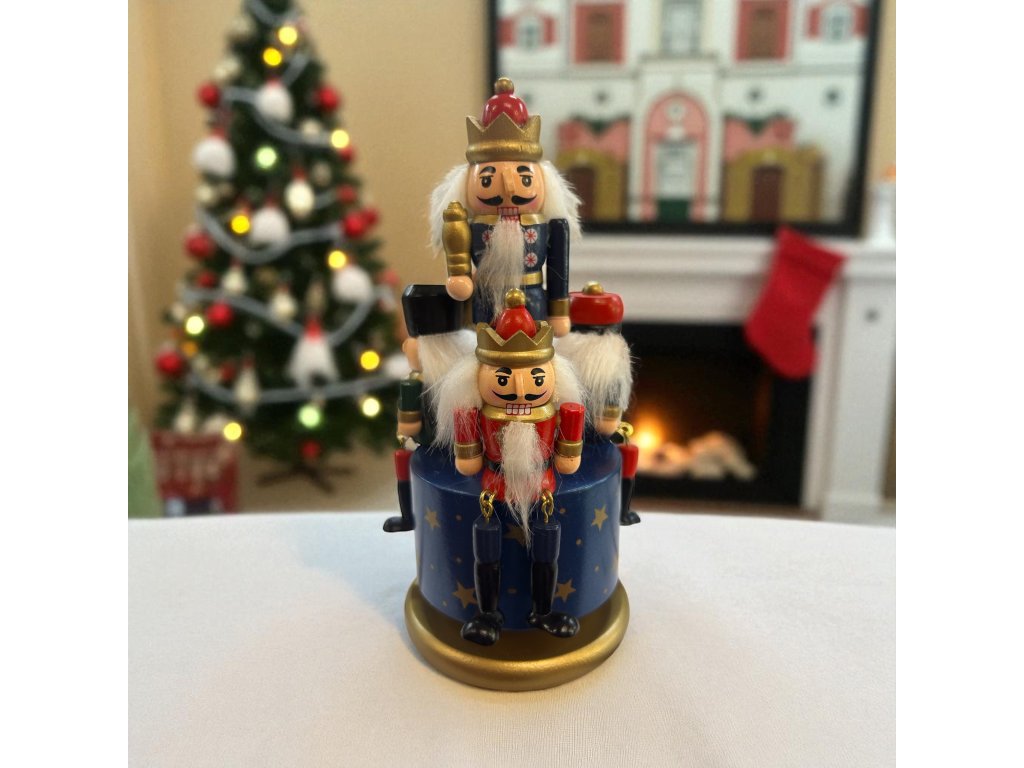 Krásný hudební kolotoč s louskáčky. Pokud jemně otočíte horní částí produktu, abyste jej navinuli, začne přehrávat hudbu, když se otáčí a zobrazuje všechny figurky na karuselu. Velmi dekorativní a s detailními louskáčky.