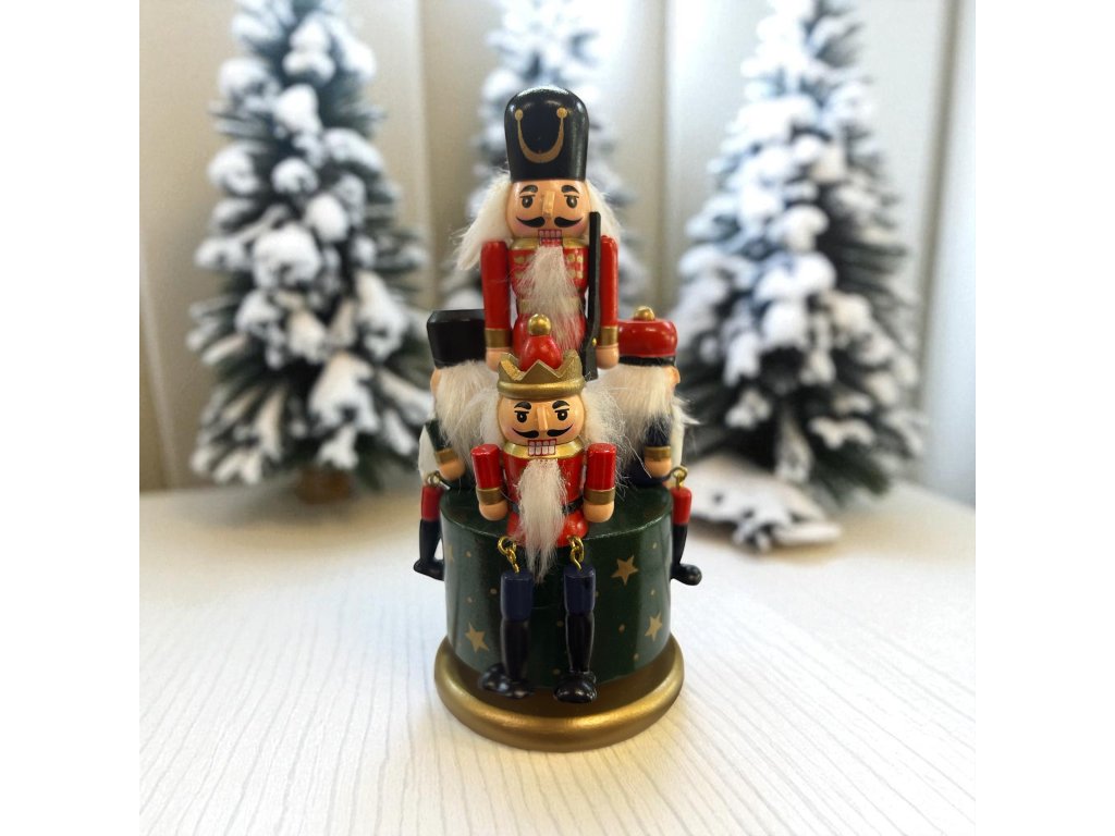 Krásný hudební kolotoč s louskáčky. Pokud jemně otočíte horní částí produktu, abyste jej navinuli, začne přehrávat hudbu, když se otáčí a zobrazuje všechny figurky na karuselu. Velmi dekorativní a s detailními louskáčky.