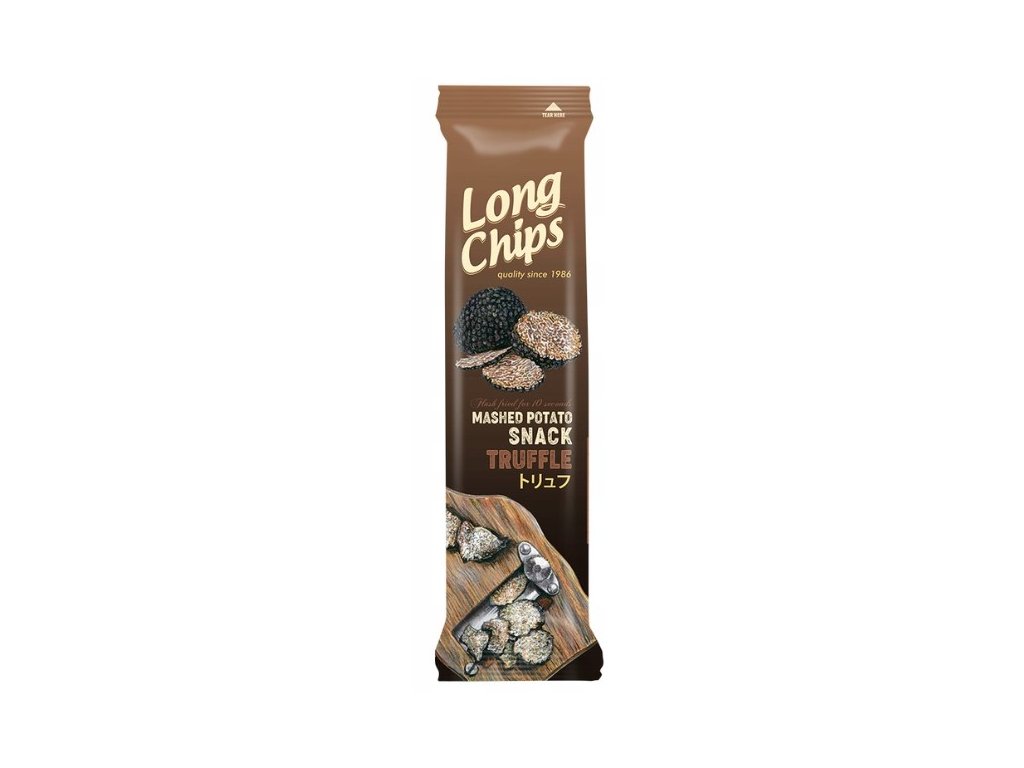 Long Chips mají originální tvar – jsou dlouhé, ploché a velmi tenké. Umístěny v tácku, aby se nezničily. Jsou k dispozici v pečlivě vybraných příchutích.