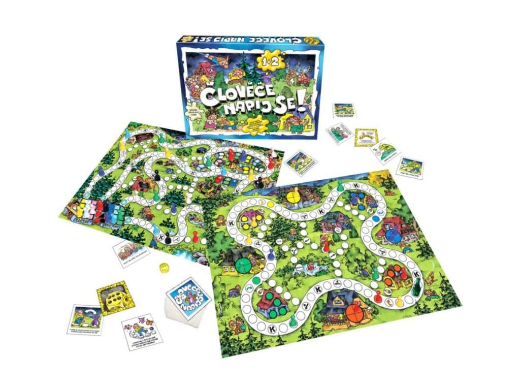 Člověče, napij se! Každý hráč má 4 figurky stejné barvy, které musí dostat ven z hospůdky, projít s nimi herním plánem a umístit je do svého domečku. Cesta je plná nástrah a překvapení.
