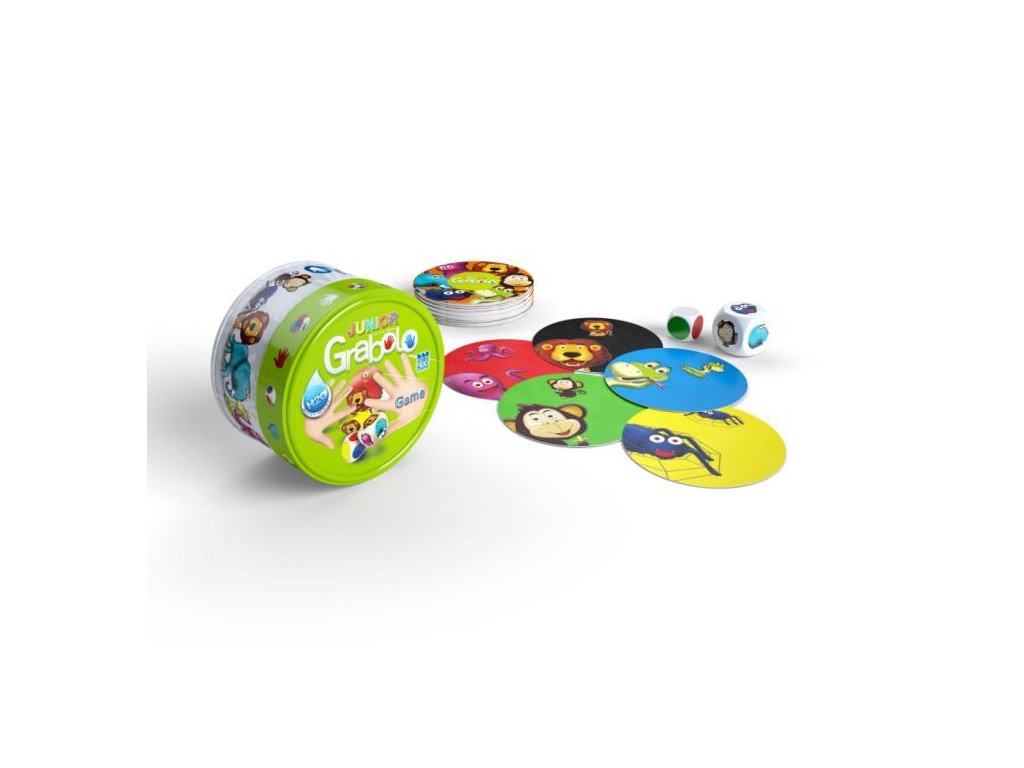 Dětská verze oblíbené postřehové hry GRABOLO. Dokaž, že máš u stolu nejlepší oči a nejrychlejší ruce. Kostky určí kombinaci barvy a obrázku, ty musíš rychle reagovat. Cílem hry je získat předepsaný počet karet.