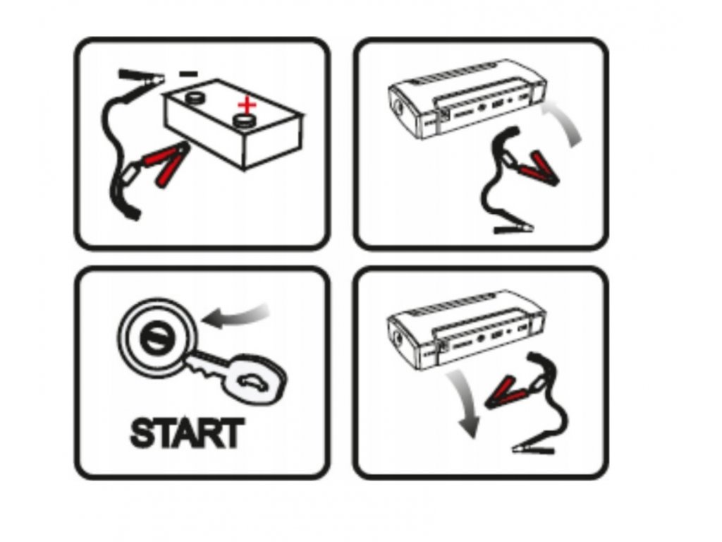 Zařízení je navrženo tak, aby každý uživatel zvládl jeho obsluhu. Pro nastartování vozidla stačí připojit kladný a záporný kabel kabelu k kladnému a zápornému pólu baterie. Poté připojte druhý konec startovacího kabelu ke vstupu zařízení. Otočte klíčkem v zapalování auta. Po nastartování auta odstraňte svorky z baterie.