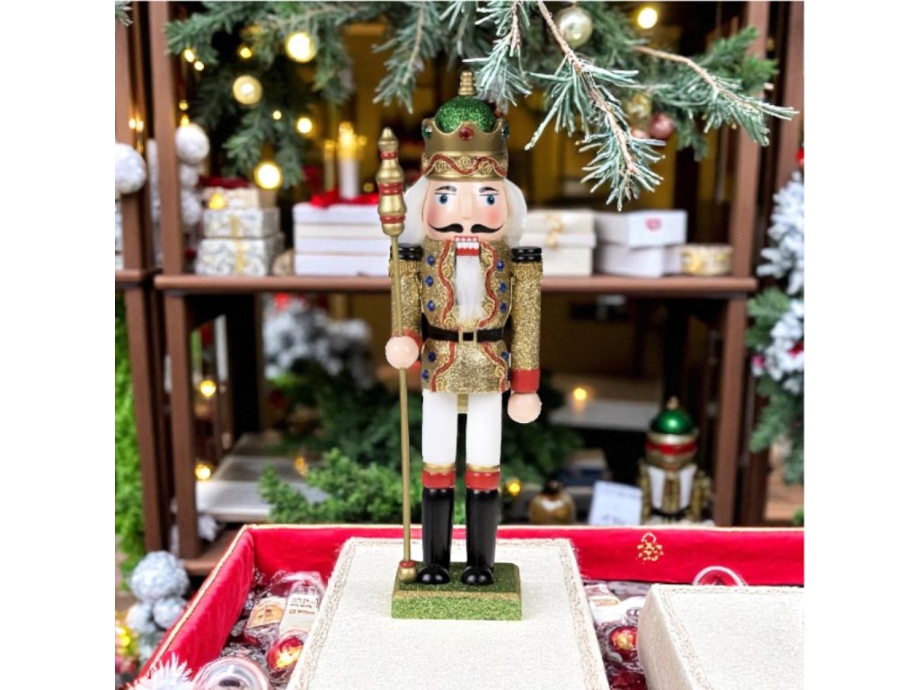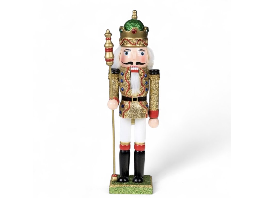 Vánoční dekorace louskáček - Zlato-zelený třpytivý s holí (30 cm)