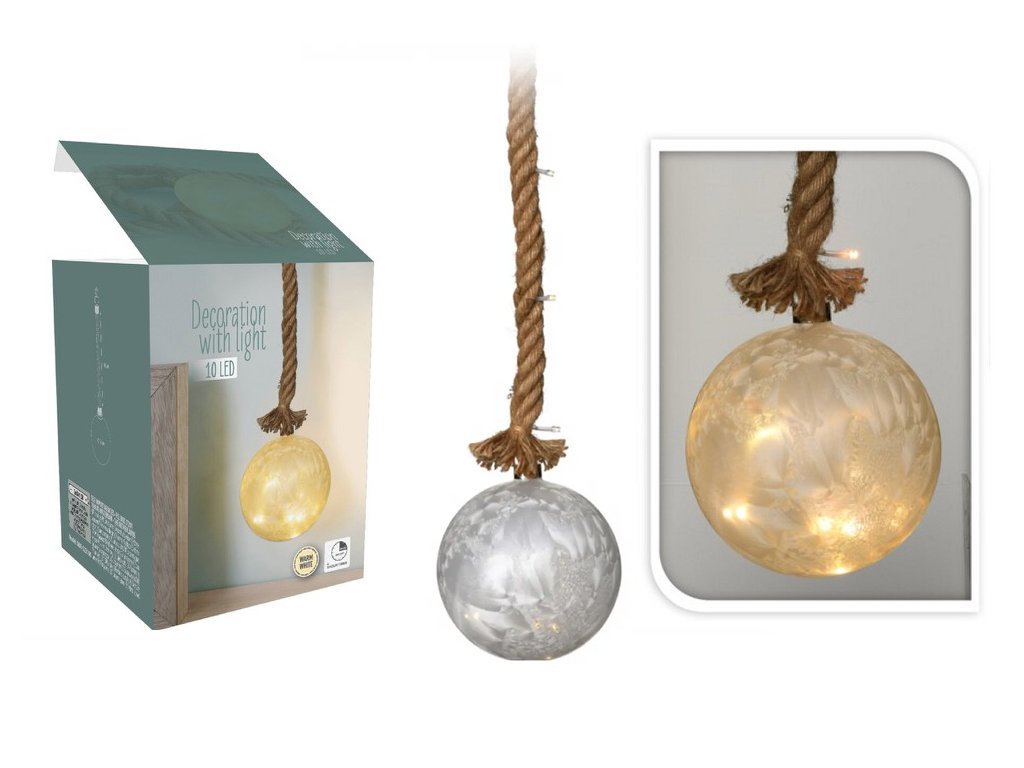 Skleněná svítící koule s ledovým efektem zavěšená na tlustém laně. Překrásná svítící vánoční dekorace. Na konci lana oko pro zavěšení. Nejen pro zavěšení a nejen na vánoce. Dekorace je vhodná pro celoroční použití. K osvětlení terasy nebo balkonu. Vytvoření příjemné atmosféry u večerní sklenky vína. Dekorace vánoční koule vypadá skvěle i na prostřeném vánočním stole.