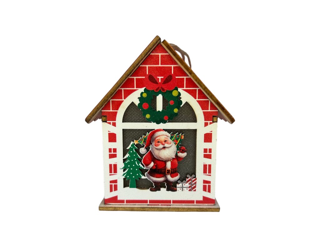Vánoční LED závěsná dekorace na zavěšení - Domeček se Santa Clausem (8x9x7 cm)