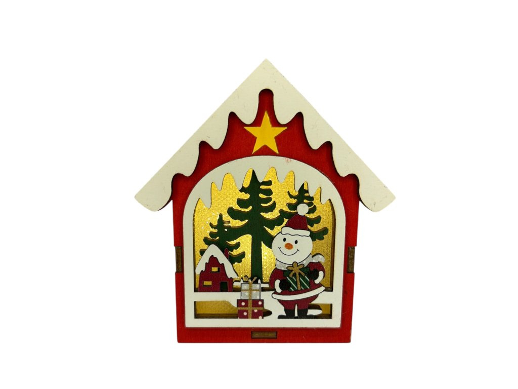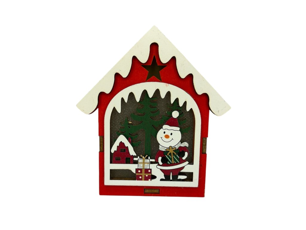 Vánoční LED závěsná dekorace na zavěšení - Domeček se sněhulákem (8x9x5 cm)